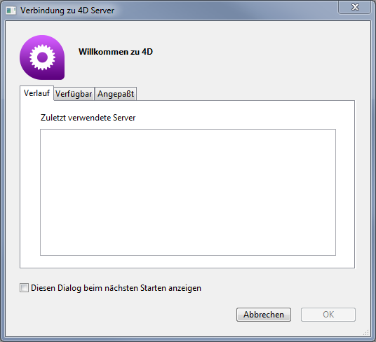 Auf dem Bildschirm erscheint der Anmeldedialog für 4D Server. Er enthält 3 Registerkarten, über die Sie auf folgende Seiten zugreifen können: Verlauf, Verfügbar und Angepasst.
