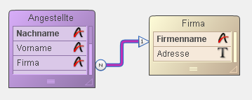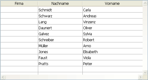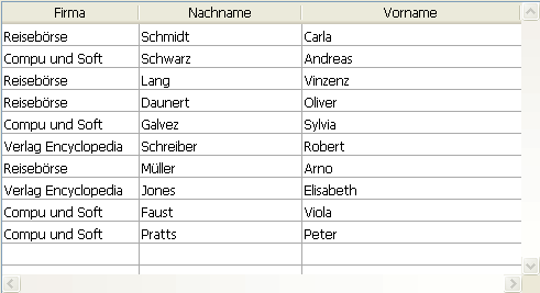 Das Datenfeld [Firma]Firmenname wird mit der ersten Spalte einer Listbox verknüpft. Die Datenfelder [Angestellte]Nachname und [Angestellte]Vorname werden mit den nächsten beiden Spalten verknüpft. Die Datenquelle der Listbox ist die aktuelle Auswahl.