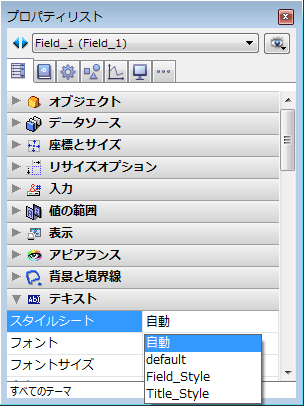 作成したスタイルシートはフォームエディターのプロパティリストから使用することができます。スタイルシートはテキストを含むオブジェクトであれば適用することができます: ボタン, フィールドおよび変数オブジェクト, タブコントロール, リストボックス, 等。