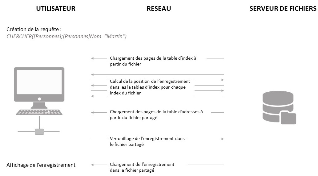 Dans le modèle du partage de fichiers, chaque station de travail effectue en local toutes les actions de modification sur les données. Cela a pour conséquence de créer un trafic réseau très important, car chaque requête nécessite de nombreuses communications à travers le réseau. Le schéma suivant présente un exemple de trafic réseau généré lorsqu'un utilisateur recherche chaque personne dont le nom est “Smith”.