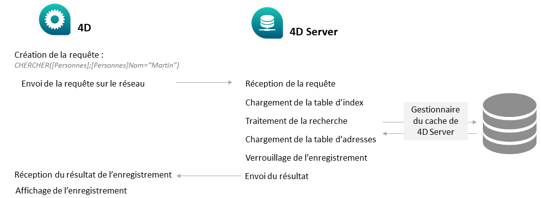 Pour rechercher un ensemble d'enregistrements, par exemple, un poste client envoie une requête au serveur. Dès réception de la requête, 4D Server exécute la recherche en local (c'est-à-dire sur le poste serveur) et, lorsqu'elle est terminée, en retourne le résultat (les enregistrements trouvés).