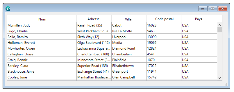 Comme la taille de la fenêtre ne permet d'afficher que dix enregistrements et cinq champs à la fois, 4D Server envoie exactement dix enregistrements. Au lieu d'envoyer la totalité des enregistrements, 4D Server n'envoie que le nombre d'enregistrements et de champs pouvant être affichés dans la fenêtre. Si l'utilisateur fait défiler les enregistrements dans le formulaire, 4D Server envoie les enregistrements et les champs supplémentaires à mesure qu'ils apparaissent dans la fenêtre. Cette optimisation réduit le trafic réseau, car les enregistrements et les champs ne sont envoyés que lorsque c'est nécessaire.