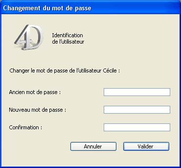 Pour pouvoir modifier son mot de passe, l’utilisateur doit indiquer son ancien mot de passe. Le nouveau mot de passe doit être saisi puis confirmé. Une fois la boîte de dialogue validée, si la saisie est correcte, le nouveau mot de passe de l’utilisateur remplace l’ancien dans la base de données. L’utilisateur doit alors saisir son nouveau mot de passe puis cliquer sur le bouton Connecter pour ouvrir la base.