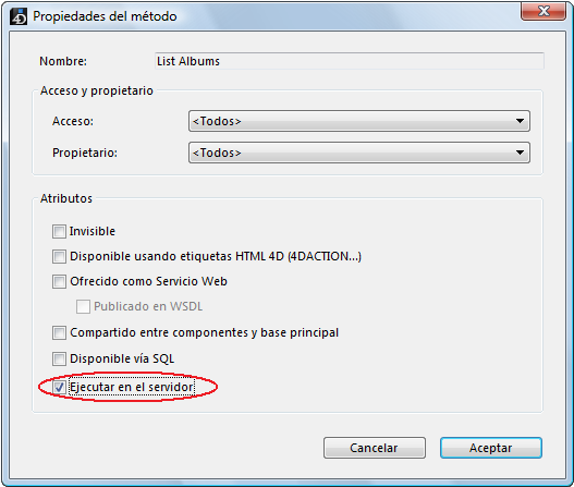 El atributo dle método de proyecto "Execute on Server" puede definirse en la siguiente caja de diálogo de modificación global de los atributos o en la caja de diálogo de las propiedades del método: