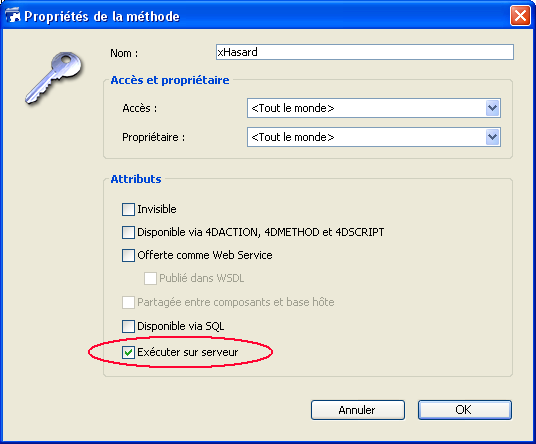 L'attribut de méthode projet "Exécuter sur serveur" peut être défini dans la boîte de dialogue de modification globale des attributs ou dans la boîte de dialogue des propriétés de la méthode :