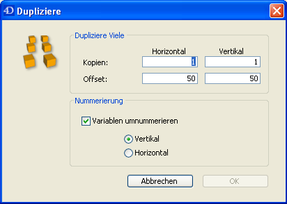 Um ein oder mehrere Objekte über das Dialogfenster Dupliziere zu duplizieren, gehen Sie folgendermaßen vor: