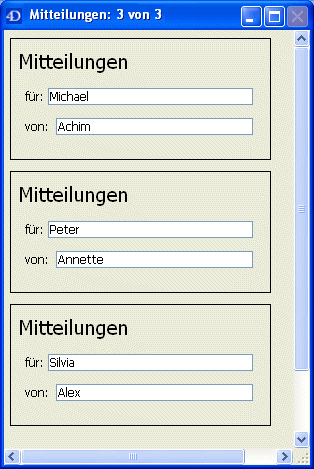 In 4D können Sie für jeden Datensatz mehrere Zeilen verwenden. Dazu erweitern Sie den Datenbereich, so dass mehr als eine Zeile Platz hat. Dann empfiehlt es sich auch, Datenfelder und Datensätze durch grafische Elemente, wie Linien und Kästchen, zu trennen.