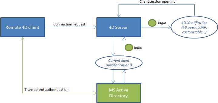 Cuando las funcionalidades SSO están activas (ver arriba), puede confiar en la autenticación de usuario basada en las credenciales de sesión de Windows para abrir una sesión de usuario en 4D Server.