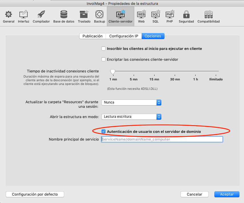 en la configuración de la estructura de la base, para un uso con 4D Server.
