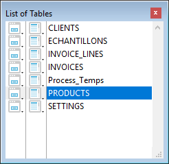 Each table name in the window is preceded by two icons symbolizing the input and output forms. The left-most icon