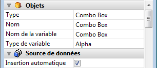 L'option Insertion automatique est disponible dans le thème "Source de données" de la Liste des propriétés pour les objets de type Combo box :