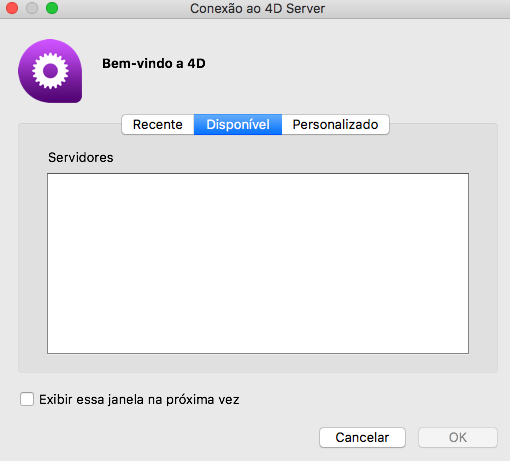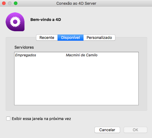 Se não aparece esta caixa de diálogo, escolha o comando Abrir>Base de dados remota... no menu Arquivo de 4D: