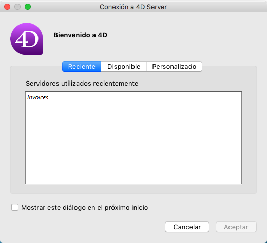 Si selecciona la opción Mostrar este diálogo en el próximo inicio, esta caja de diálogo se mostrará automáticamente al inicio de la aplicación 4D.