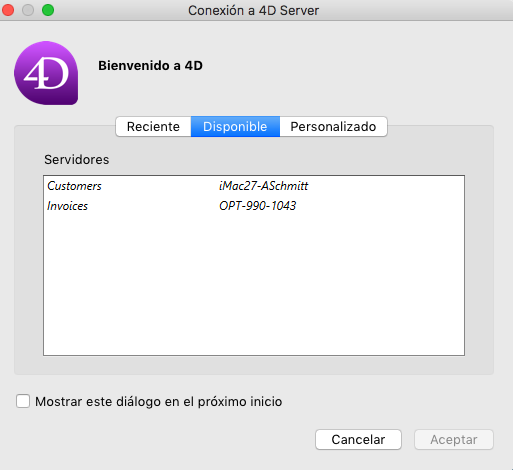Nota de compatibilidad: en modo IPv4, sólo las bases publicadas en el puerto por defecto (19813) están visibles en la pestaña Disponible. Cuando se activa IPv6 (ver Soporte de IPv6), todas las bases de datos 4D Server publicadas en la red están visibles en la pestaña Disponible. Si no desea que aparezca una base de datos, debe anular la selección de la opción de publicación (consulte la nota anterior).