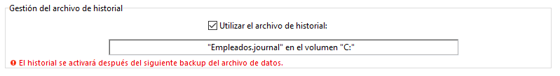 La opción Utilizar el archivo de historial, cuando está seleccionada, indica que la base utiliza un archivo historial. Su ruta de acceso se encuentra debajo de esta opción. Cuando esta opción está