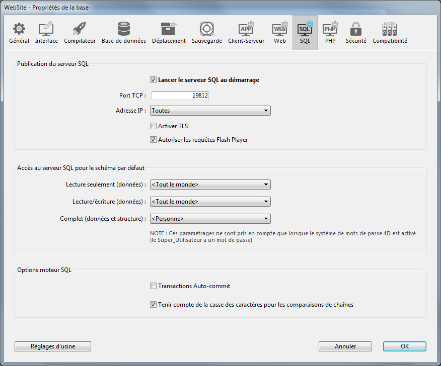 Ces paramétrages peuvent être effectués via la page SQL des Propriétés de la base.