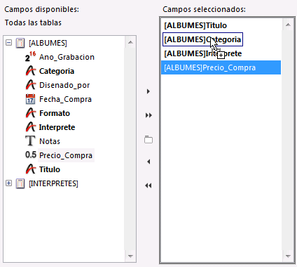Seleccione los campos que quiere en su formulario en el área “Campos disponibles”. Puede hacer doble clic en los campos, utilizar arrastrar y soltar o utilizar los botones del panel central: Puede seleccionar todo tipo de campo, excepto los campos de tipo Blob. Puede crear formularios que incluyan campos provenientes de: