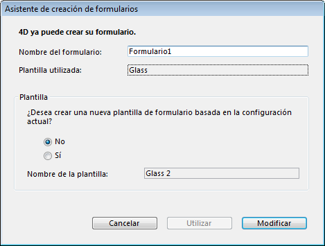 Para crear el nuevo formulario, haga clic en el botón Utilizar para pasar a probar el formulario (formularios de tabla únicamente) o Modificar para abrir el nuevo formulario en el editor de formularios.