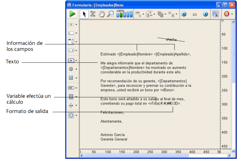 Puede especificar la manera como se mostrará un campo o variable insertando un punto y coma seguido por un formato de salida (ver GET LIST ITEM PARAMETER) después del nombre del campo o variable. Por ejemplo, el documento de fusión de correos mostrado anteriormente incluye un formato de salida para la variable vTotal. La variable <vTotal;$###,##0.00> calcula el monto del bono de la persona y lo muestra en un formato adecuado.