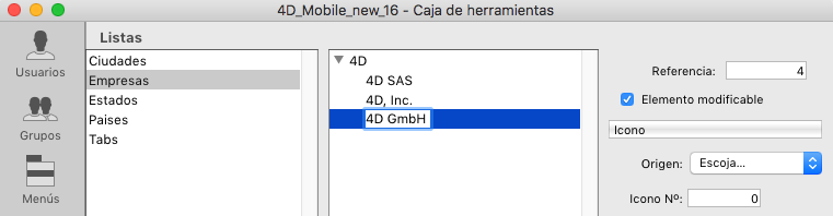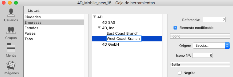 4D despliega el elemento seleccionado de la lista y añade un nuevo elemento (llamado por defecto Nuevo elemento n°X) para el primer valor de la sublista. - Introduzca el valor del elemento.