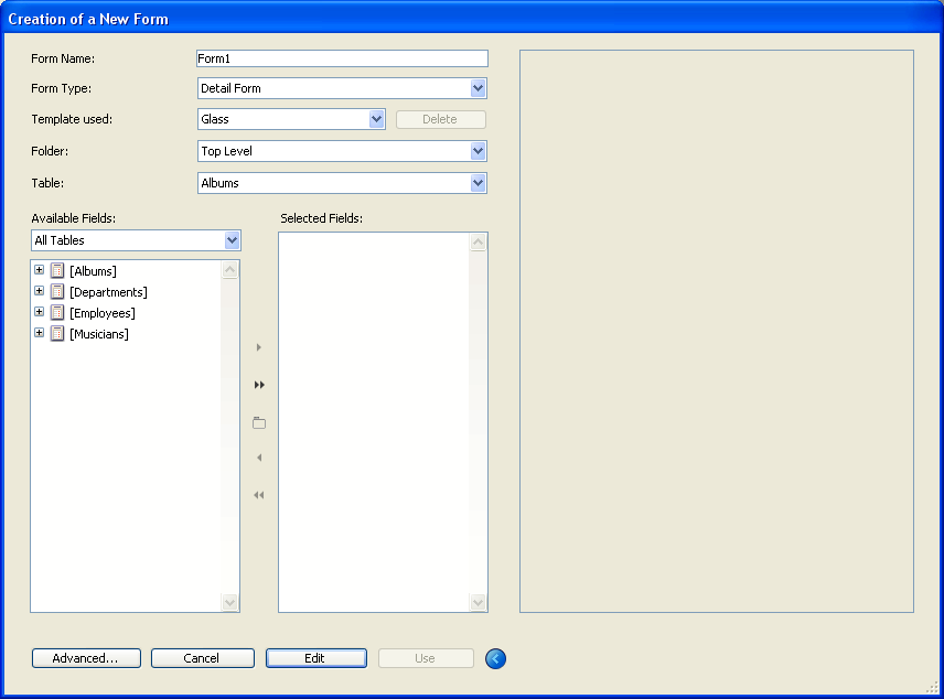 Select the fields you want on your form from the “Available Fields” area. You can double-click on the fields, use drag and drop or use the buttons in the central panel: You can select any fields of any type, except BLOB fields. You can create forms that include fields from: