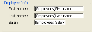 (Optional) If necessary, create one or more group boxes in the Selected Fields list. Note: This function is not available for list forms. A group box has its own label and a set of fields. It looks like this: To make a group box, click on the group box button . An item is added in the Selected Fields list. Its default name is “Group.” You can rename it as necessary. Note: The name of a group box is static text; you can use a “localizable” reference as with any 4D label (see Using references in static text and COPY SET). You can add fields to the group box by simply dragging them over from the Available Fields list and dropping them onto the new item. The Selected Fields list takes the form of a hierarchical list. As each field is added to the group box, it appears below the group box name. Note: When a group box item is expanded, you can add fields to it that are already in the Selected Fields list by drag and drop.