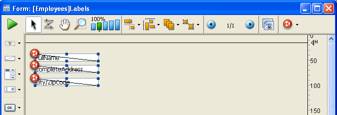 If the form size is set to "automatic" or relative to a specific object, its width is computed by adding the horizontal margin to the anchor's coordinates.Insert and set the objects making up each label. - Labels may contain fields and active objects (with which you can associate methods if desired), as well as graphic objects and static text. A subform cannot be printed in a label.