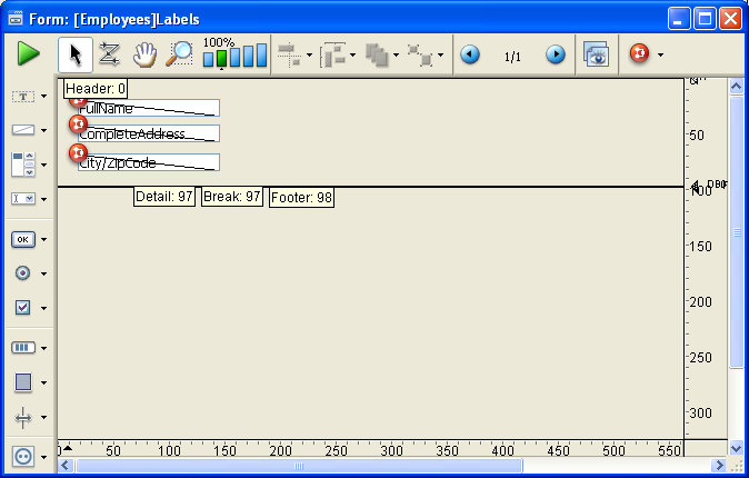 Be sure to take the left and right margins of your labels into account. You can determine these margins by calculating the space between each label and dividing this number by two. For example, if you have labels that are 2.25 inches wide with a margin of .125 inches (1/8 inch) on either side of each label, the label width marker should be placed at 2.625 inches (2 3/8 inches) to ensure that the label text is placed correctly on the labels - Set the control lines so that the Header control line is above the label and the Detail, Break, and Footer control lines are below the label.