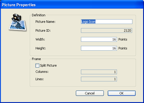 You can create a sequence of frames from a picture already placed in the Picture Library or when you add a picture to the Picture Library. In both cases, you set how the picture is to be divided into separate frames in the Picture properties dialog box. If you are creating a picture, the dialog box appears automatically. Otherwise, double-click on the picture or select it and choose Picture Properties from the options menu of the library.