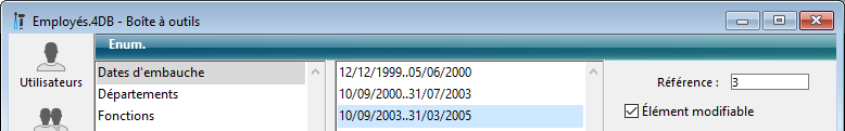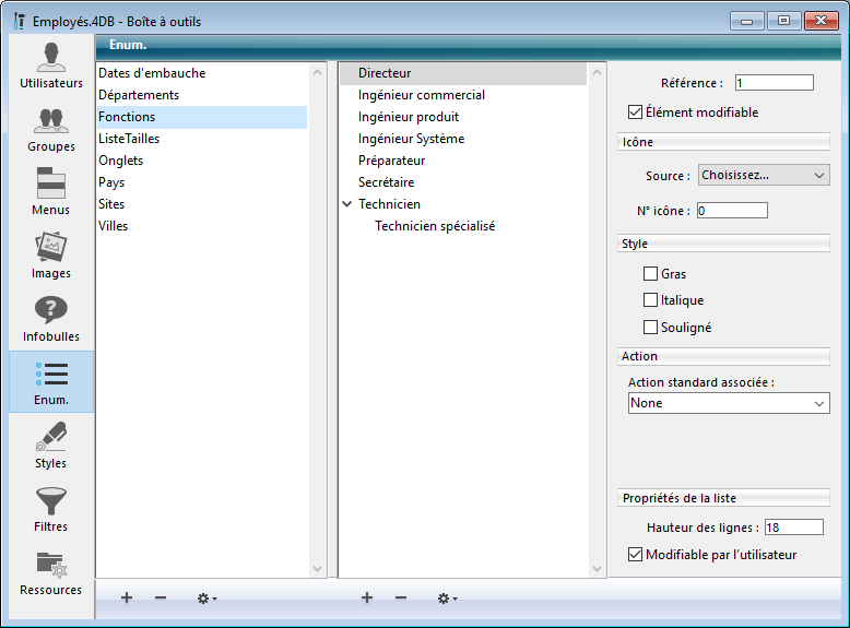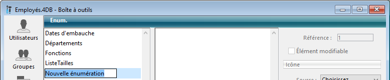 Les énumérations sont crées à l’aide de l’éditeur d’énumérations, situé dans la boîte à outils. Vous pouvez modifier toute énumération à tout instant en retournant dans l’éditeur d’énumérations et en réalisant les modifications.