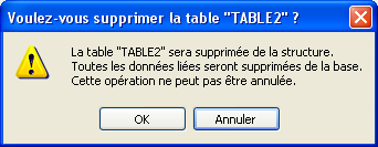 La table est définitivement supprimée de la structure. Toutes les données associées à la table sont définitivement supprimées du fichier de données.