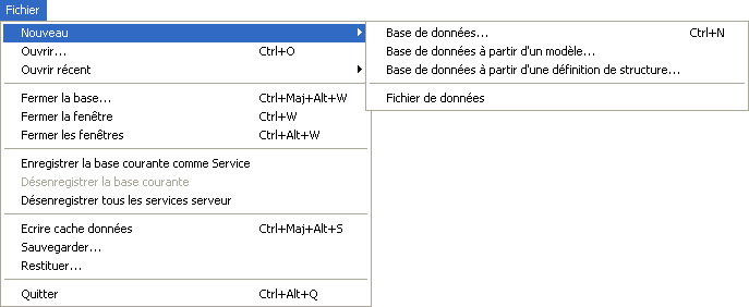 Pour créer une nouvelle base, choisissez une des commandes du sous-menu Nouveau> :