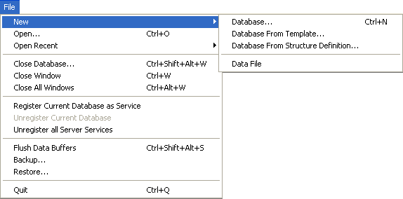 Para criar um novo banco de dados, escolha um dos comandos do submenu Novo>:
