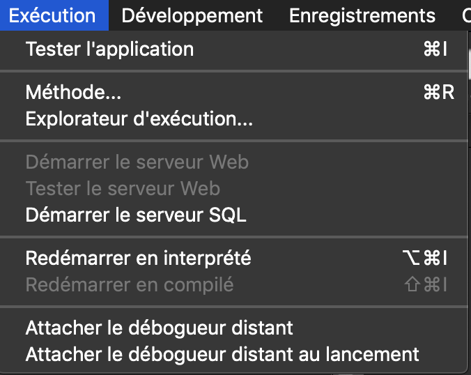 2. Dans un 4D distant connecté au serveur, sélectionnez Attacher le débogueur distant dans le menu Exécution: