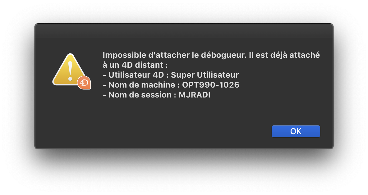 Si le débogueur est déjà attaché à un 4D distant ou à 4D Server (par défaut), aucune autre machine ne peut s'associer au débogueur.