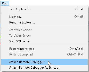 - You can attach back the debugger to the server by selecting Attach Debugger from the Edit menu (if not attached to a remote 4D, see Rejected attachment requests). - In a remote 4D connected to the server, select Attach Remote Debugger from the Run menu:
