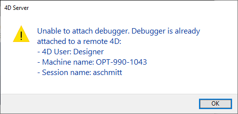 While the debugger is already attached to a remote 4D or to 4D Server (default), no other machine can attach the debugger.