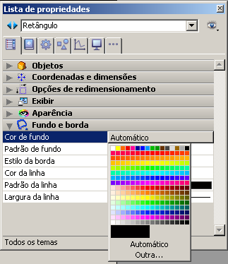 Pode definir cores diferentes para o fundo e o borde dos objetos, utilizando o comando Cor do menu contextual do editor ou diretamente em listas de propriedades.