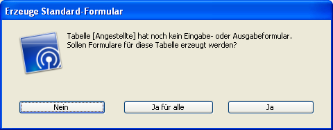 Auf dem Bildschirm erscheint das Fenster für Datensätze. 4D stellt fest, dass der Tabelle noch keine Formulare zugeordnet sind und fragt Sie, ob das Programm diese anlegen soll.