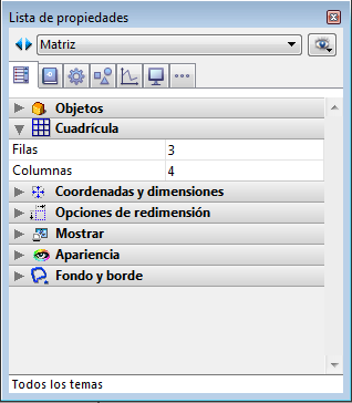 Asegúrese que cada celda en la matriz sea lo suficientemente grande para que contenga el objeto a duplicar. - En el tema “Cuadrícula” de la Lista de propiedades, defina el número de columnas y de filas de la matriz.