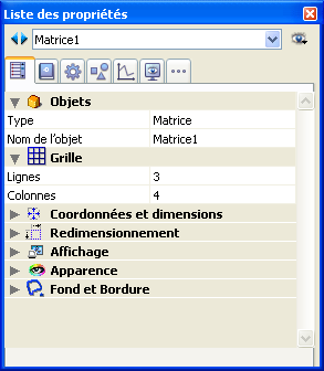 2. Dans le thème “Grille” de la Liste des propriétés, définissez le nombre de colonnes et de lignes que vous souhaitez attribuer à la matrice.