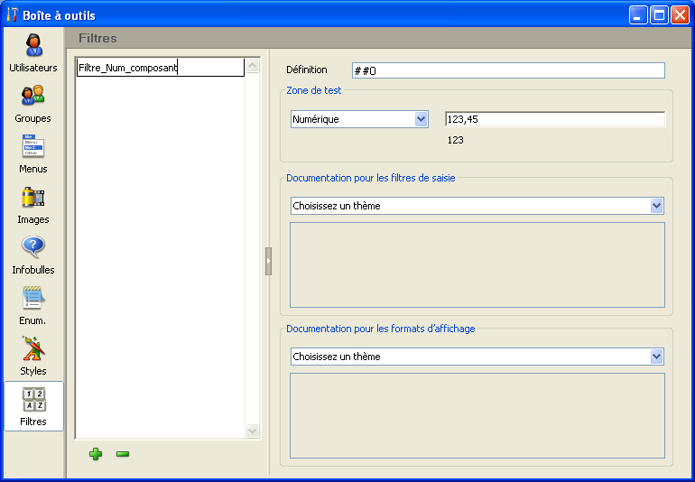 Les zones “Documentation pour les filtres de saisie” et “Documentation pour les formats d’affichage” de la fenêtre d’édition des filtres et formats sont composées d’un menu et d’une zone d’affichage.