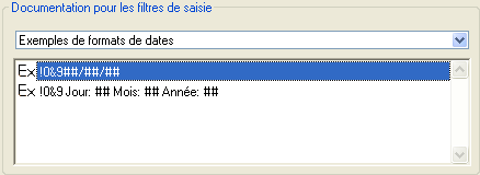 Pour plus d’informations sur les caractères des formats d’affichage et des filtres de saisie, reportez-vous à la section Codes des filtres et formats.