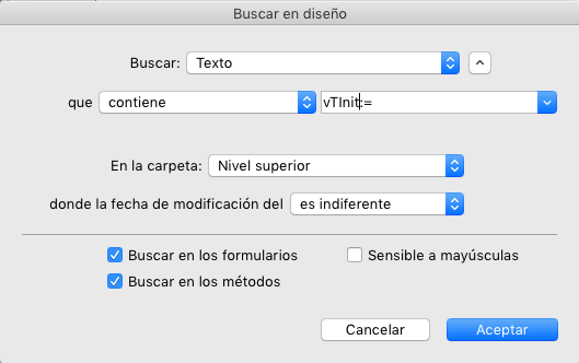 • Texto: en este caso, 4D busca una cadena de caracteres en todo el entorno Diseño.