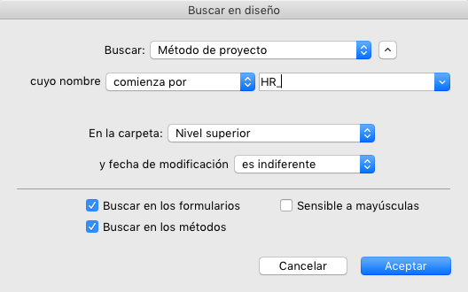 • Buscar en los métodos: cuando esta opción está deseleccionada, la búsqueda global se efectúa por toda la base, excepto en métodos y en nombres de métodos.