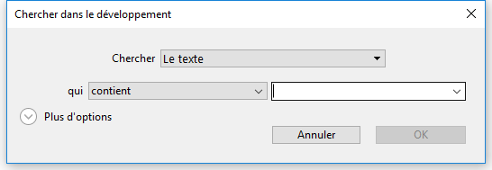 Vous définissez vos critères de recherche dans la fenêtre "Chercher dans le développement". Pour cela :