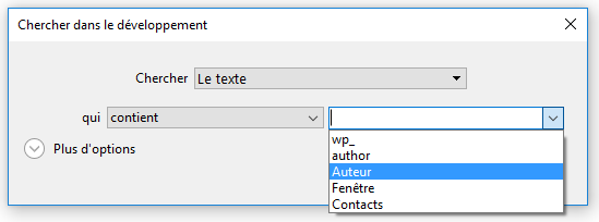 contient : recherche la chaîne parmi les textes du mode Développement. La recherche de "var" trouvera "mavar", "variable1" ou "avarie".