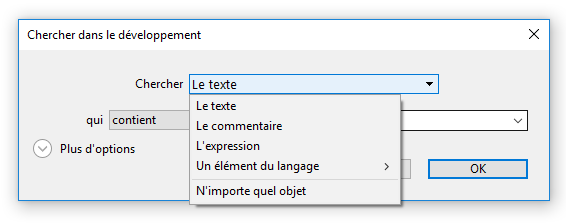 Recherche d’élément du langage : lorsque ce type de recherche est sélectionné, le menu propose les options standard (est exactement, contient, commence par, se termine par). A noter que vous pouvez utiliser le joker de recherche (@) avec l’option est exactement (retourne tous les objets du type défini).