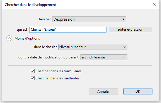 L’expression de langage : permet de rechercher toute expression 4D valide, effectuée en mode "contient". La notion de validité est importante car 4D doit pouvoir évaluer l’expression pour la rechercher. Par exemple, une recherche sur l’expression "[clients" n’aboutira pas (expression invalide) alors que "[clients]" est correct.