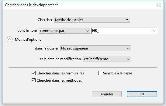 Chercher dans les méthodes : lorsque cette option est désélectionnée, la recherche globale est effectuée partout dans la base, sauf dans les méthodes et les noms de méthodes.